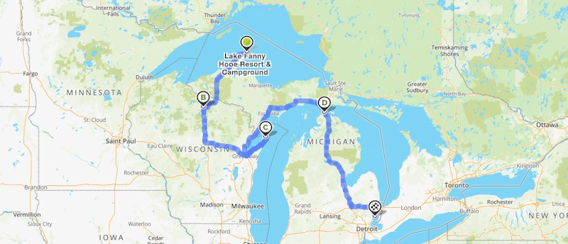 Copper Harbor, MI to Bailey’s Harbor, Wi, then on to New Baltimore, MI (northeast of Detroit)