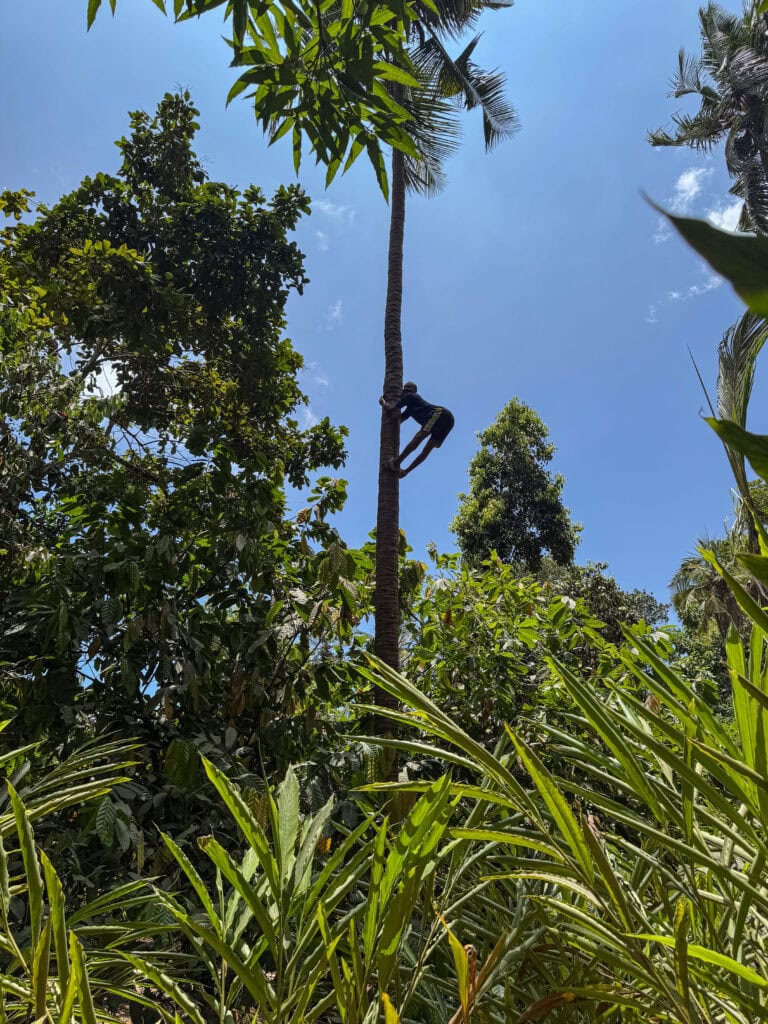 Tangawizi Spice Farm – the Butterfly Man entertained while climbing a coconut tree.